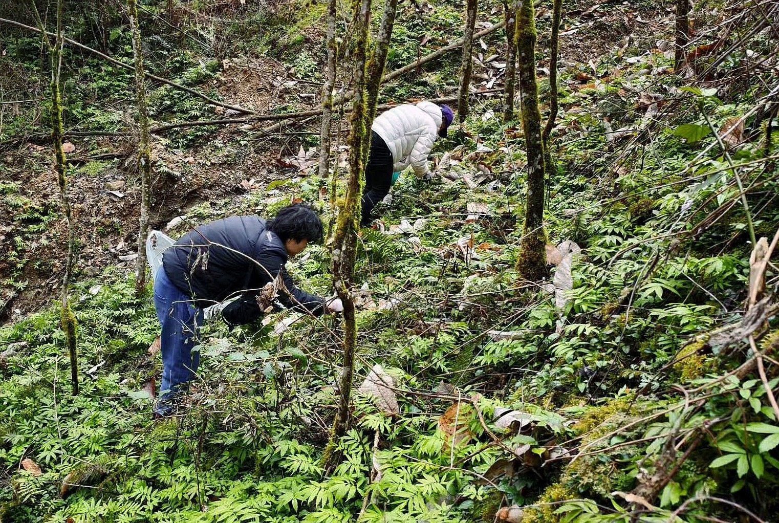 游客正在山间挖野菜。(平武县委宣传部供图)
