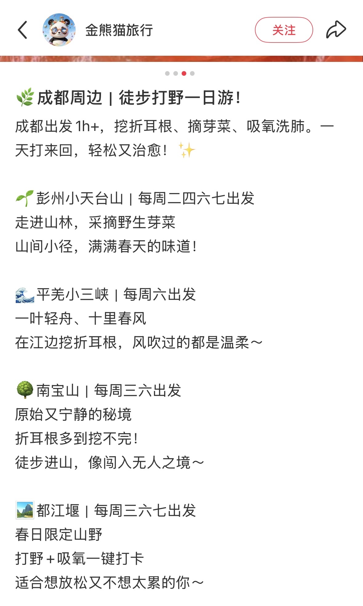 年轻人的追捧,催生出越来越标准的“打野”团。博主@自由者不二家旅行介绍,仅4月1日至6日,就推出40多个“徒步+打野”线路,价格在50元至100元不等,包含车费、门票与清洁费,30人即可成团。